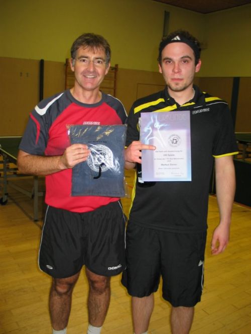 Vor 13 Jahren hat Markus Simon (rechts) als Jugendlicher bei den Tischtennisfreunden Bad Wörishofen diesen schönen Sport erlernt. Mittlerweile ist er Mannschaftsführer der III. Herrenmannschaft in der 1. Kreisliga. Im Match gegen den SC Blau-Weiß Ettringen I bestritt er sein 300. Mannschaftsspiel und wurde für seine Treue zum Verein ausgezeichnet. Zweiter TTF-Vorsitzender Karl Deeg nahm die Ehrung vor und überreichte Geschenke. Text/Foto: Ludwig Schuster
